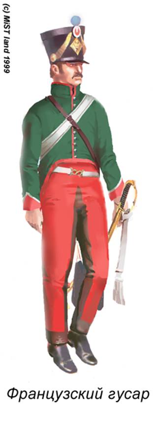 Гусары - как вид легкой кавалерии, использовались для разведки, боевого охранения, рейдов и партизанских действий. Вооружены они были саблями, пистолетами и карабинами (ружье). Французские гусары действовали следующим образом : Рыская, главным образом, вблизи основных колонн, гусарские полки обычно разворачивали эскадроны в боевой порядок и прочесывали окружающую местность. При вступлении в контакт с неприятелем, взвод передового эскадрона на галопе разворачивался перед фронтом полка, образуя стрелковую цепь. Если враг нападал, гусары-застрельщики открывали огонь из положения "на месте" с расстояния менее 100 метров, имея главной задачей поражение вражеских офицеров. Затем с пистолетом в правой руке и с саблей, свисавшей с кисти той же руки и удерживавшейся темляком, они бросались в атаку, экономя свой единственный выстрел до самого последнего момента, перекладывая затем пистолет в левую руку и атакуя холодным оружием. |